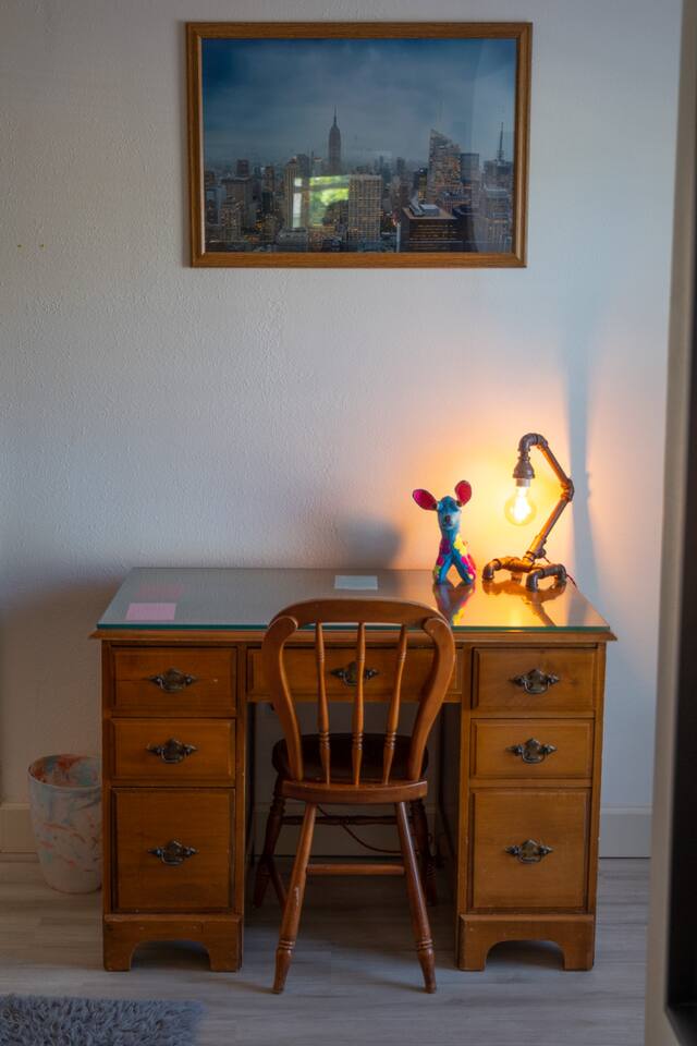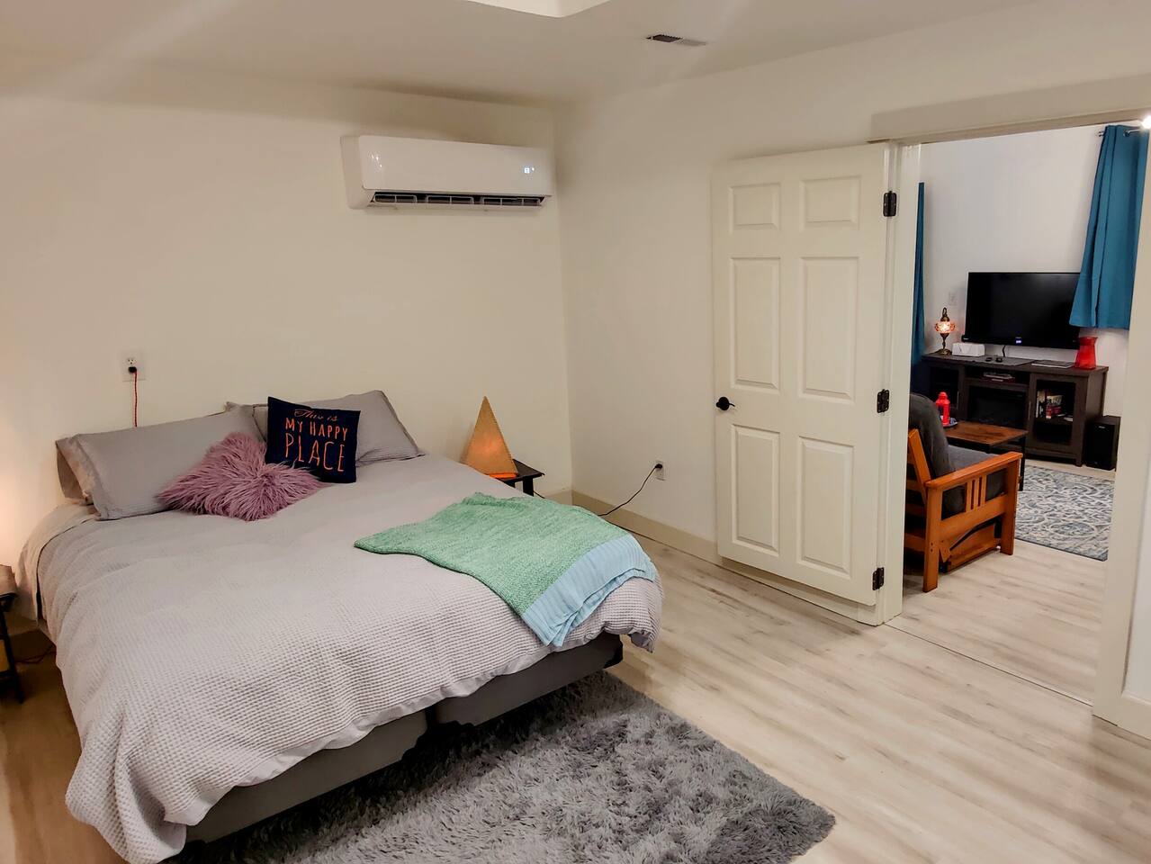 - Unwind in a comfortable queen bed with luxurious linens. - Curl up with a book in the plush armchair. - Catch up on work at the dedicated desk space with blazing fast wifi. - Cozy up by the electric fireplace in the living room, complete with a 42" Roku TV and soundbar. - The futon in the living room offers additional sleeping space for 2 guests.