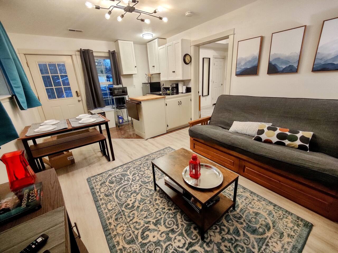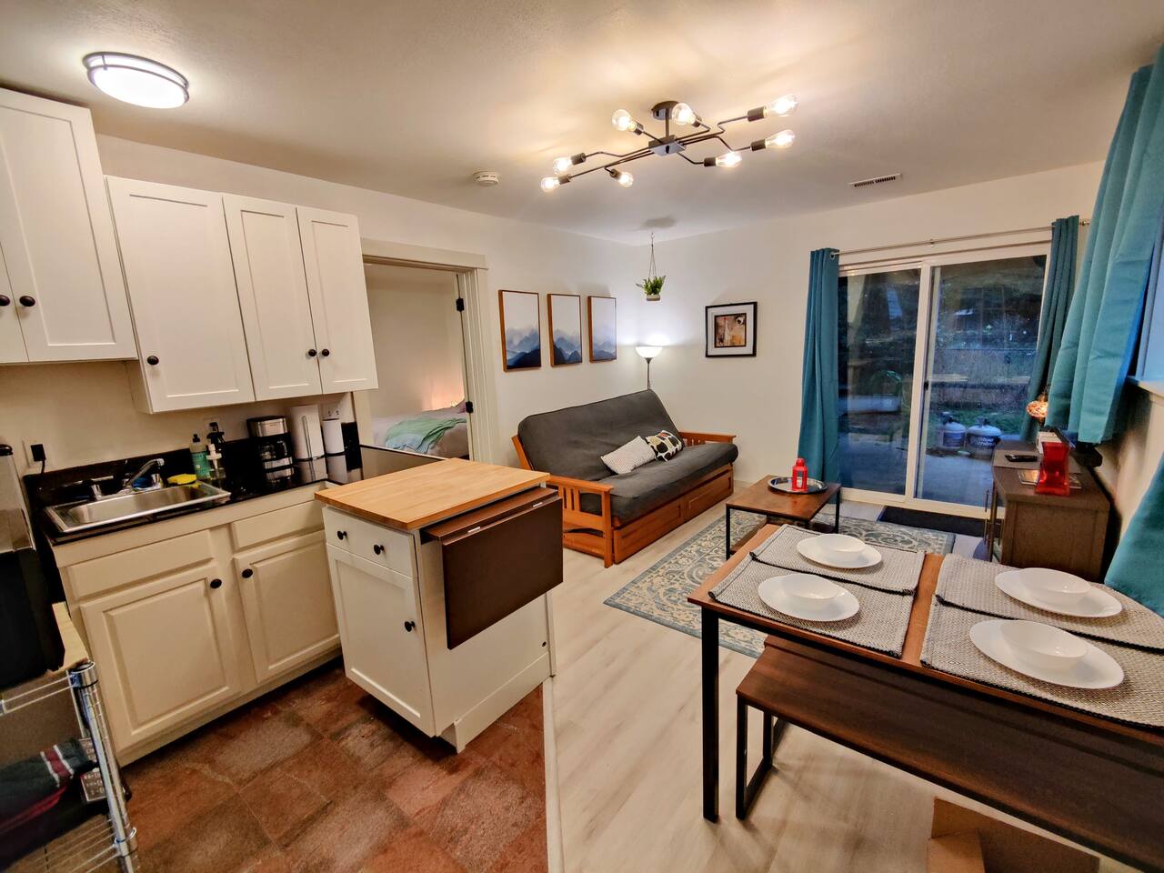 Additional Offering: For guests looking to explore sustainably, Bessie the Tessie is our 2025 Tesla Model Y and is available for rent during your stay. With Oregon’s new law requiring self-service at gas stations, you can skip the hassle of pumping gas entirely when you rent Bessie. Guests will enjoy free charging at the property throughout their visit, and we can even arrange pickup upon request. If interested, feel free to inquire after booking, and we’ll provide more details. There's also a discount available to our Airbnb guests. - Kitchenette includes microwave, coffee maker, electric kettle, a small fridge, toaster and induction cooktop. - The kitchenette is well-equipped for preparing light meals (microwave, coffee maker, electric kettle, small fridge, toaster, & induction cooktop). - Brand new mini split heat pump and A/C system ensures year-round comfort. - Designed for accessibility, featuring a step-free entrance and a wheelchair-friendly bathroom with grab bars. - Our home is a shoes off home, so please take off shoes and make yourself comfortable. - Non-smoking property. - No pets allowed. - Respectful quiet times: 10:00 PM - 8:00 AM. - We have friendly dogs on the property. You might hear them occasionally in the backyard. They are territorial, however, which is why we cannot accommodate guests with pets. - The backyard, shared with the main house, is surrounded by tall trees and an 8' privacy fence. The Casita has a covered patio with seating. - The uncovered hot tub, located between the main house and the Casita, is available year-round, even in rainy weather. - Please notify us when you want to soak so we can ensure window shades are drawn for more privacy. For sanitary reasons, we ask guests to take a quick rinse before using the hot tub. Luxury spa towels are provided in a basket near the back door. - After using the hot tub, kindly pour a full bottle of spa shock (found on the TV stand by the back door) into the tub and run the jets on high. The system will shut off automatically after the cycle. - Please notify us immediately if anything breaks to maintain the quality of your stay and future guests' experiences.